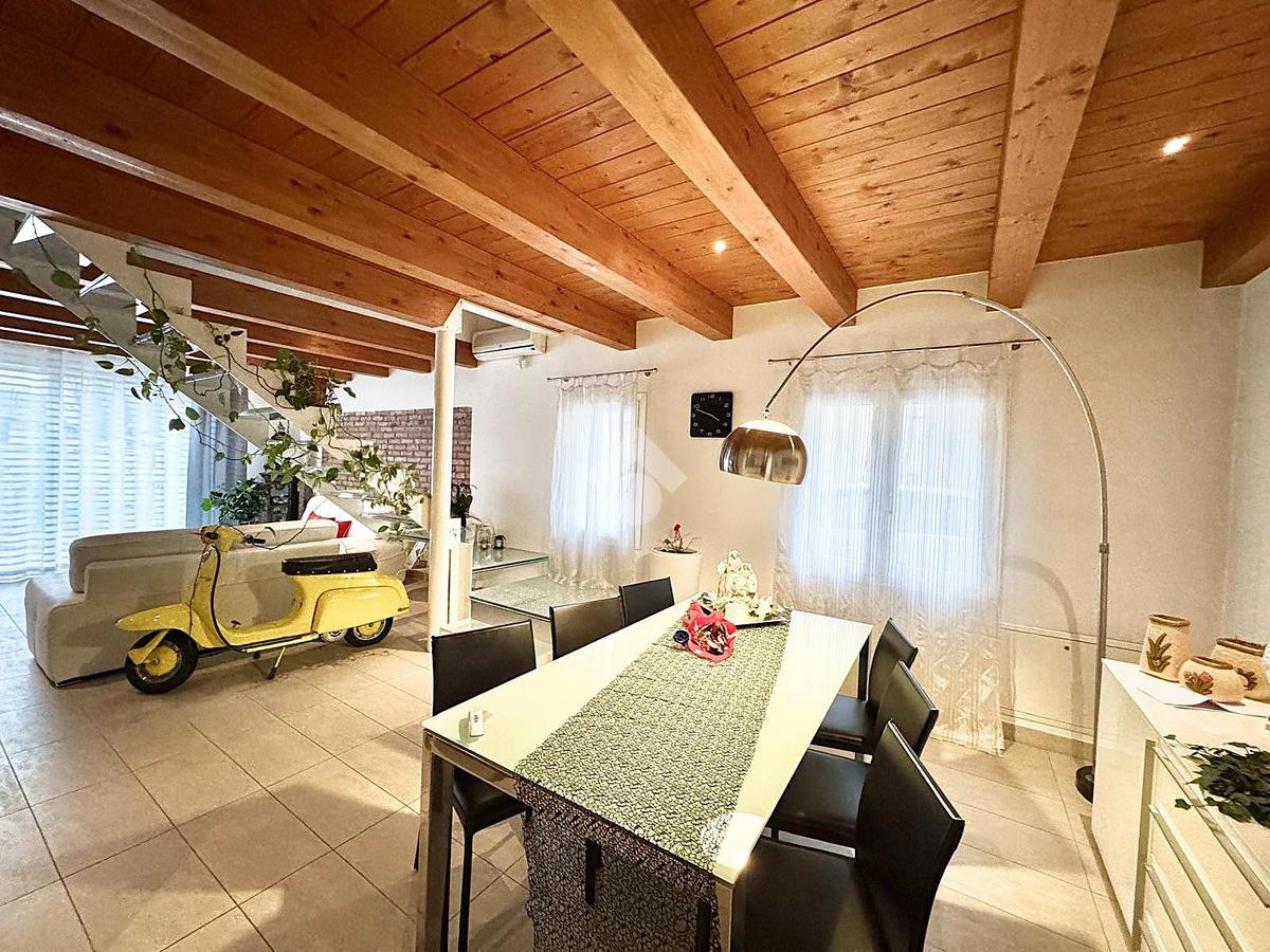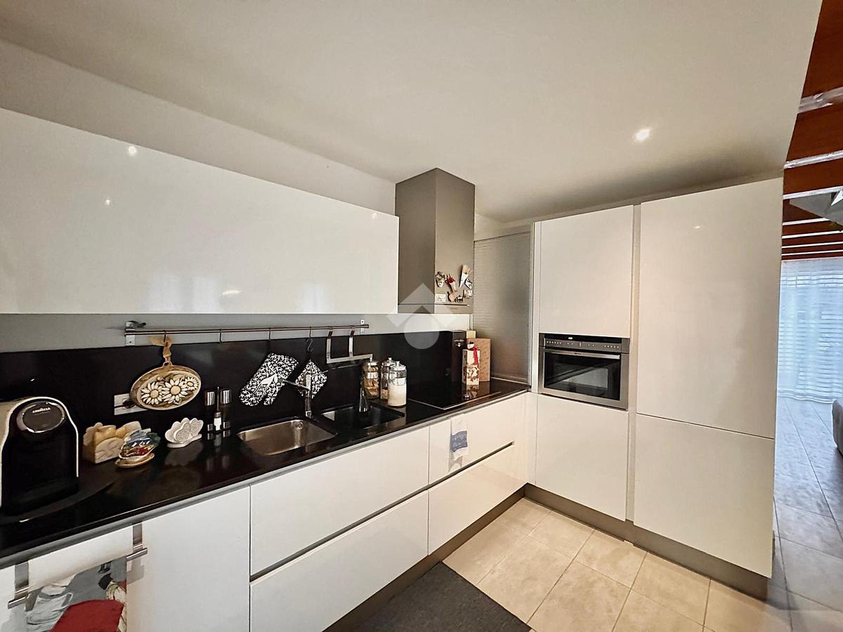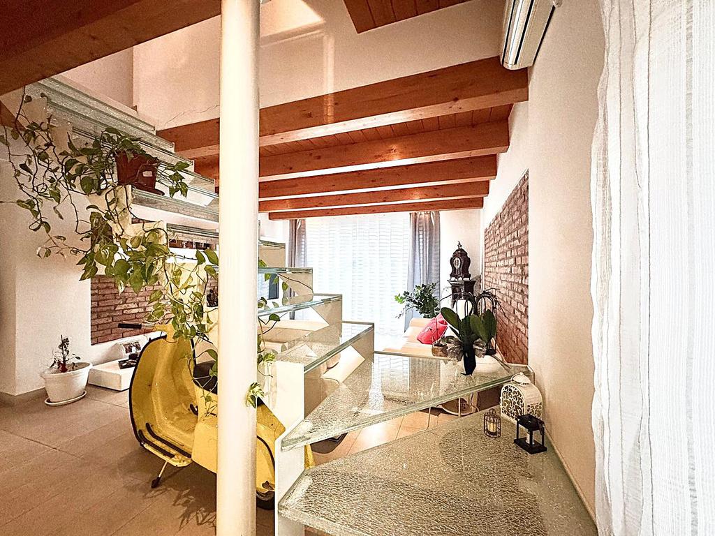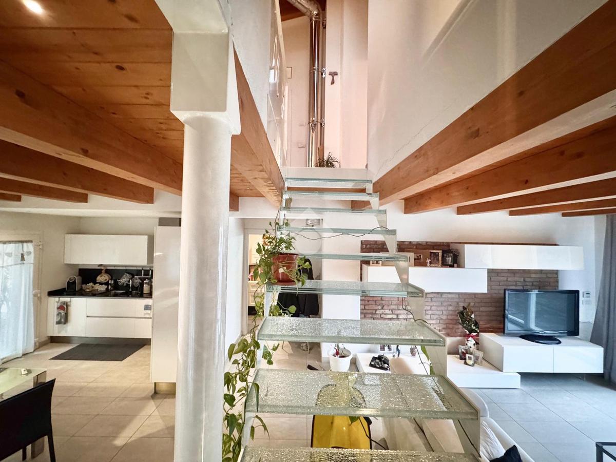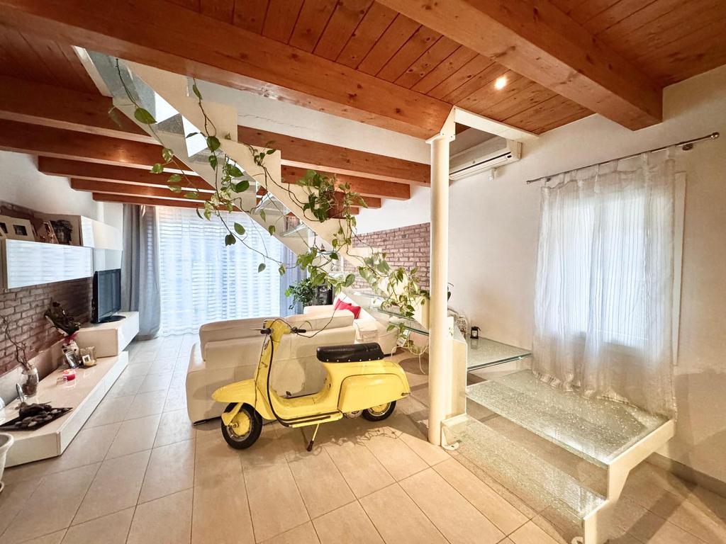 L'abitazione, disposta su due livelli, è composta al piano terra da luminosa zona giorno e da un ampio bagno. La zona living è impreziosita da una scala di design che crea una sorta di separazione tra la cucina e il salotto, inoltre l'ambiente risulta molto luminoso grazie alla presenza di un'ampia vetrata.