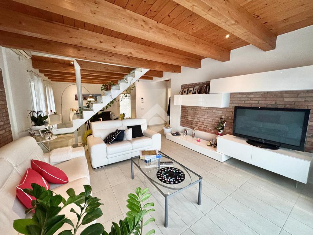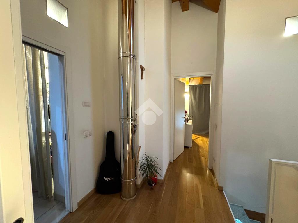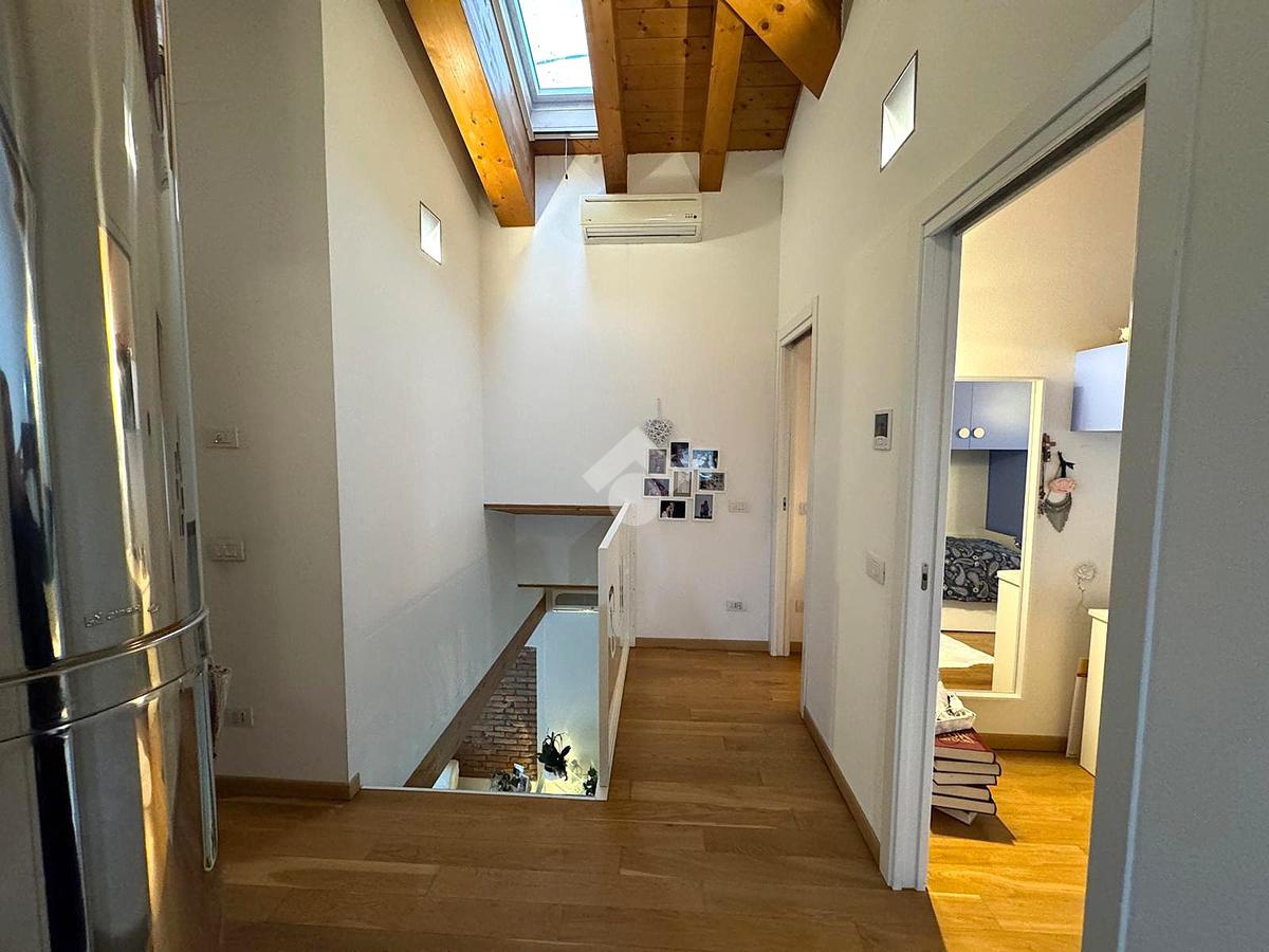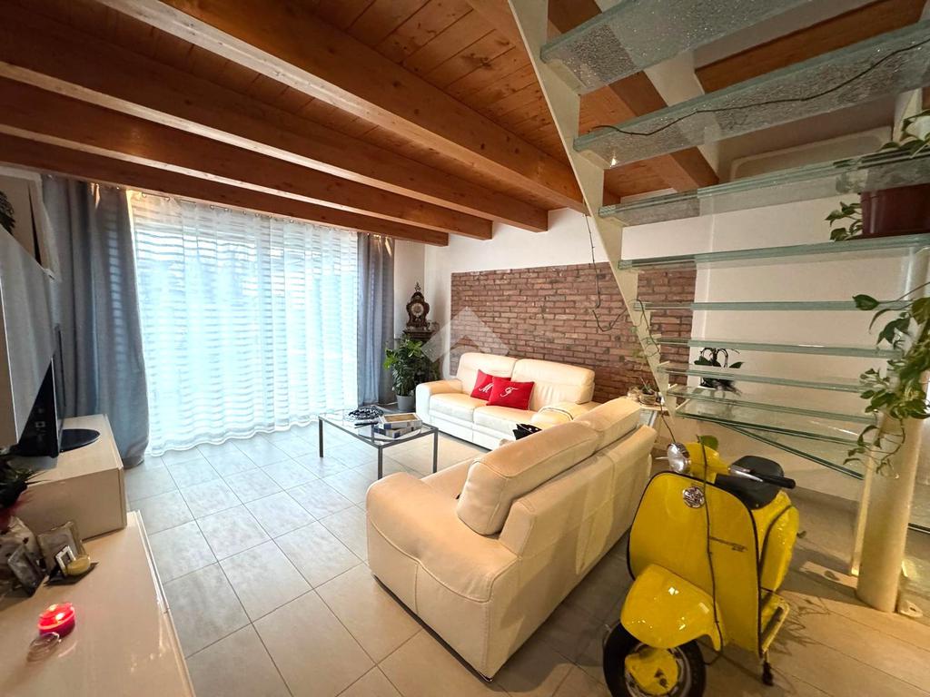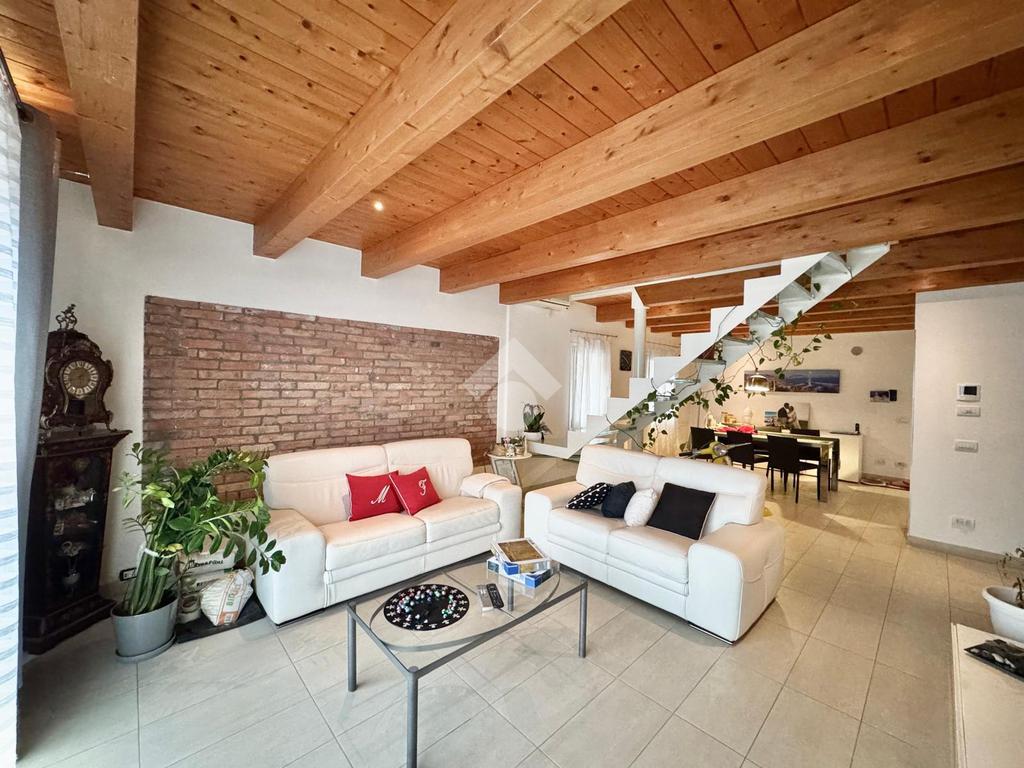 L'abitazione, disposta su due livelli, è composta al piano terra da luminosa zona giorno e da un ampio bagno. La zona living è impreziosita da una scala di design che crea una sorta di separazione tra la cucina e il salotto, inoltre l'ambiente risulta molto luminoso grazie alla presenza di un'ampia vetrata.