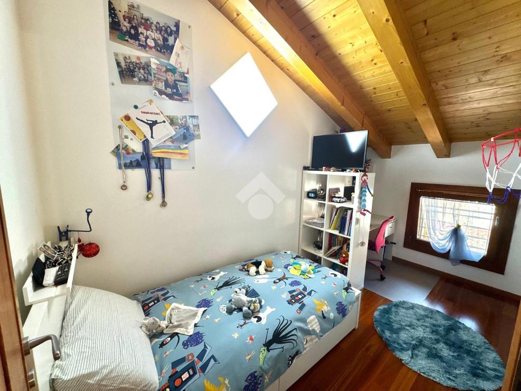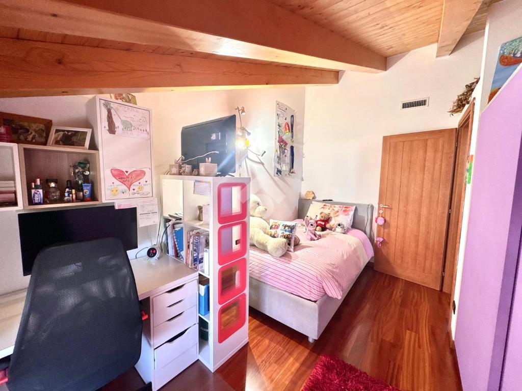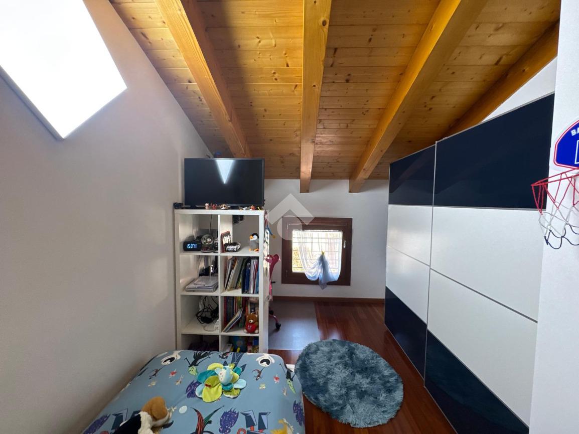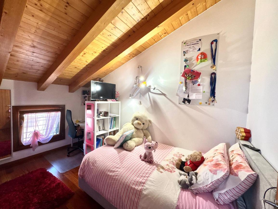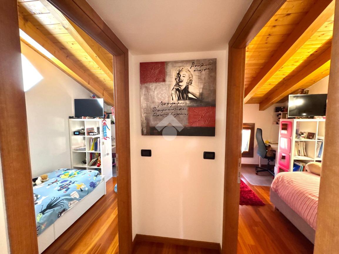 La zona notte, al piano superiore, è composta da due camere singole accoglienti con travi a vista, un secondo bagno anch'esso finestrato con doccia e una spaziosa camera matrimoniale dotata di cabina armadio e accesso diretto al terrazzo.